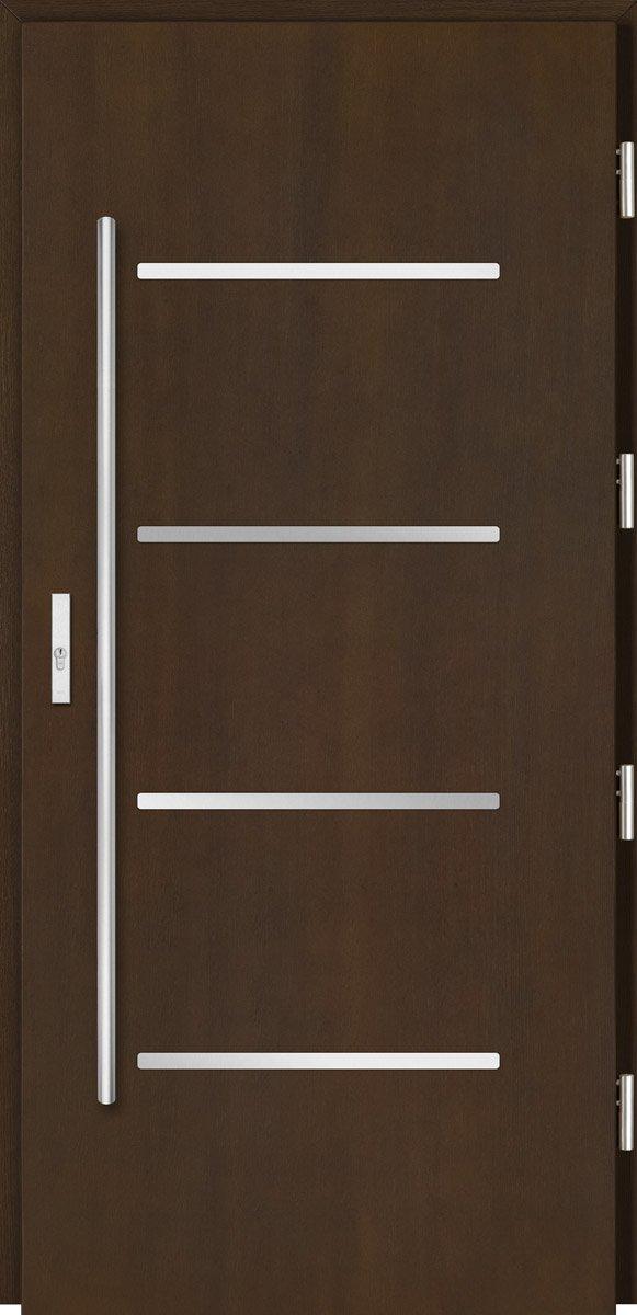 Linia Simple wyróżnia się tzw. konstrukcją "płycinową". Konstrukcja skrzydła drzwi wykonana jest z drewna sosnowego klejonego warstwowo i naprzemiennie. Dodatkowe wzmocnienie stanowią specjalne metalowe ceowniki. Za niską przenikalność cieplną odpowiada dedykowany panel termoizolacyjny znajdujący się pomiędzy ramiakami skrzydła drzwi. Od zewnątrz drzwi wykończone są wodoodporną sklejkę dębową, która zapewnia odporność na czynniki zewnętrzne jednocześnie zapewniając piękny wygląd jakim charakteryzuje się naturalne drewno.